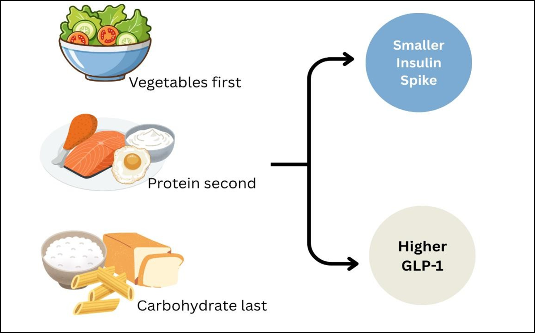 Beyond blood sugar, this approach also influences important hormones. Eating carbohydrates last increases GLP-1, a hormone that helps the body release insulin efficiently and reduces appetite, while insulin levels are lower, reflecting better metabolic control