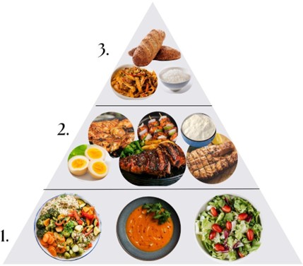 - Finish with carbohydrate sources such as rice, bread, or pasta.
