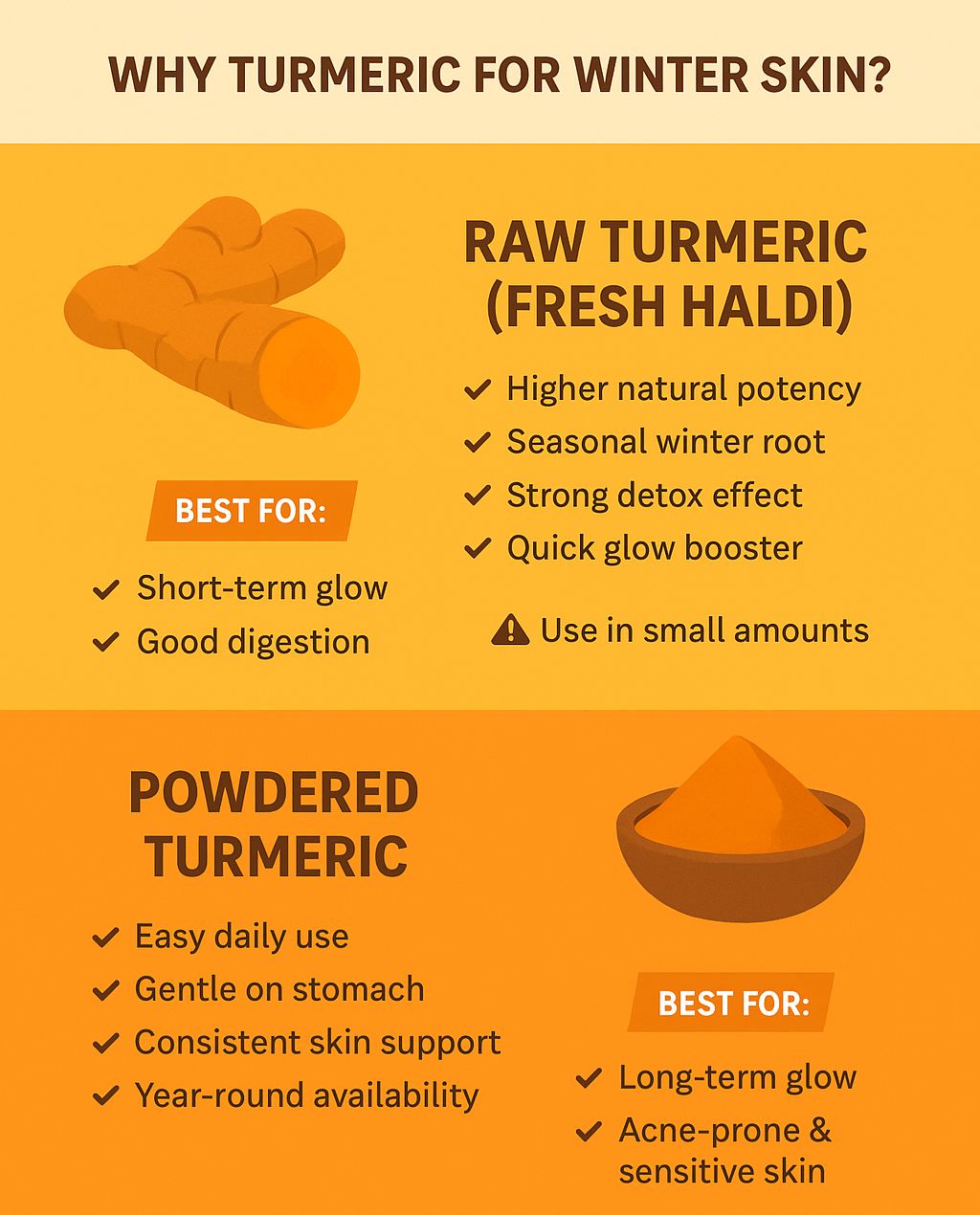 If you want a safe, effective, and sustainable glow this winter, powdered turmeric wins for everyday use, while raw turmeric can be your occasional glow ritual.